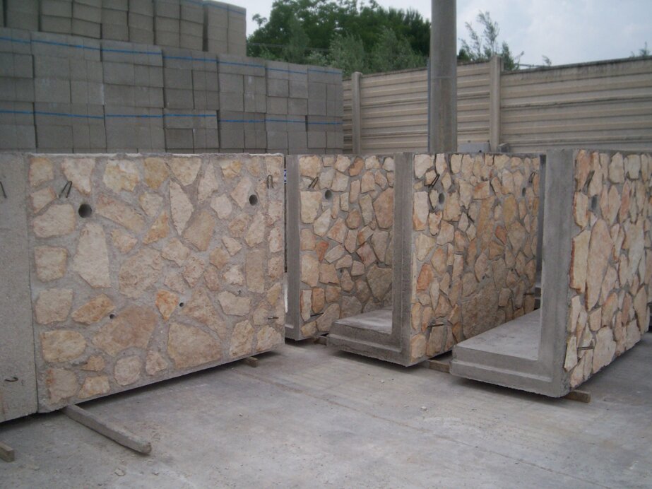 Barriere di contenimento con piede di stabilizzazione per scarpate, possono essere montate a secco con incastro o senza incastro. Sono realizzate in diverse dimensioni e forme (parete da 15 a 20 cm), risultano di facile impiego e posa, possono essere realizzate con rivestimento in pietra bianca o liscio.