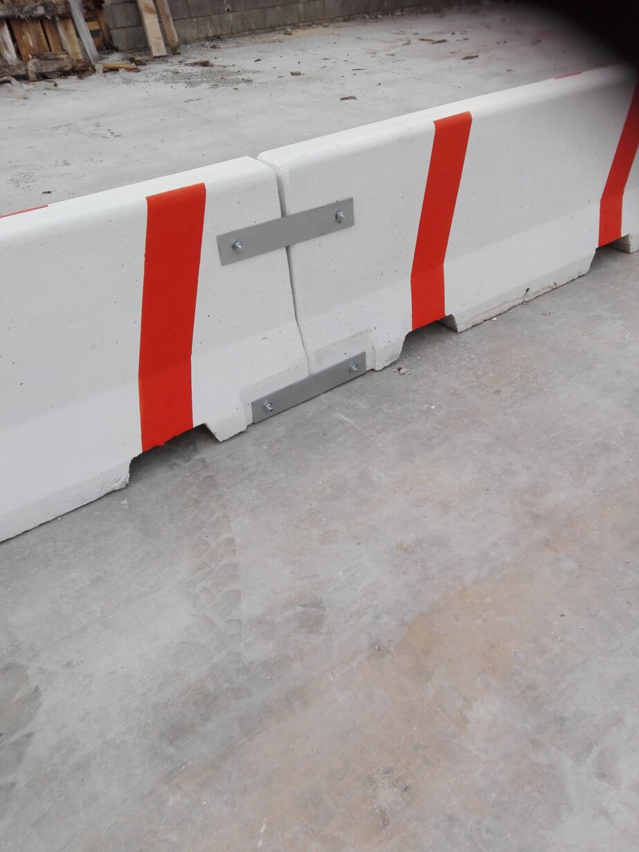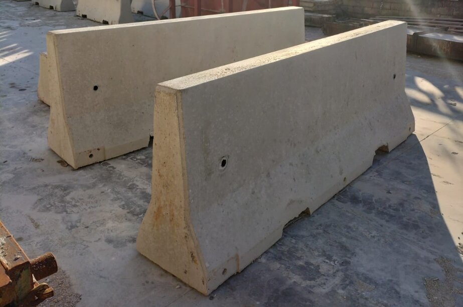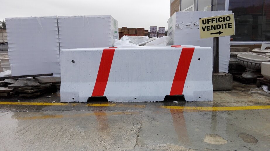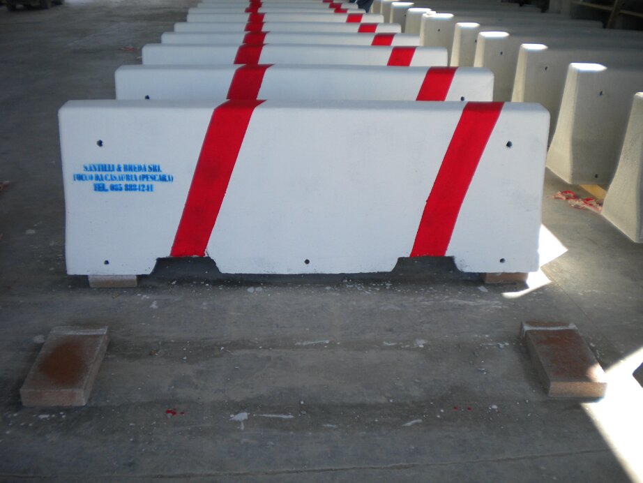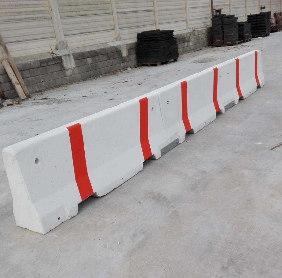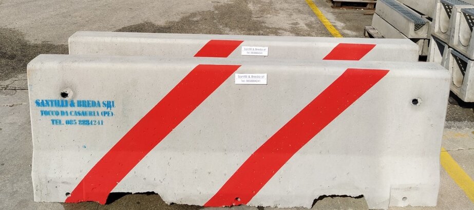 Elementi prefabbricati in calcestruzzo armato, profilo New Jersey, con fori superiori e bocche di lupo posizionate nella parte inferiore per il deflusso delle acque meteoriche.