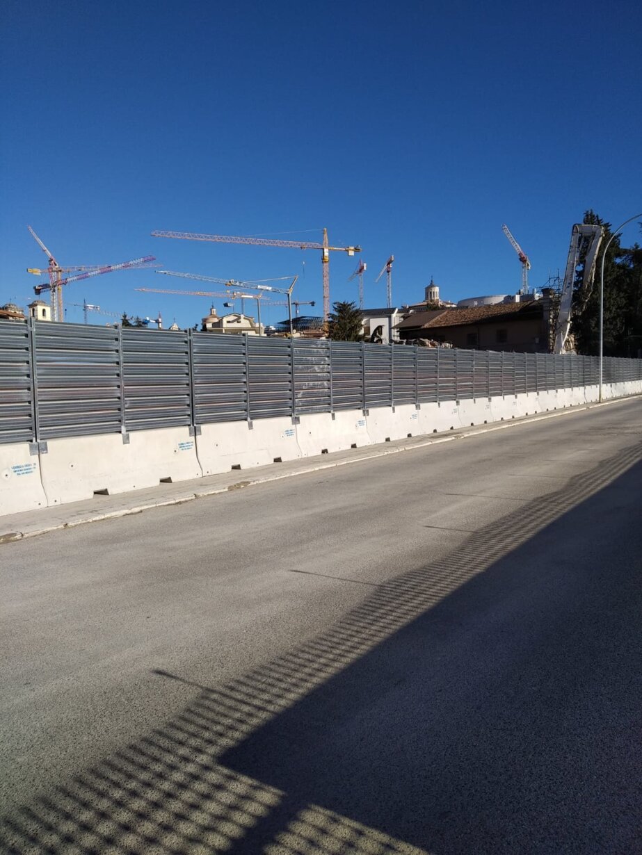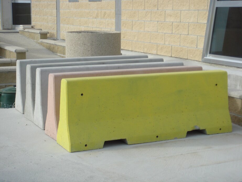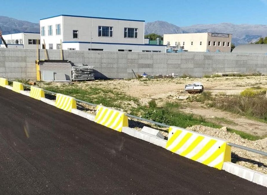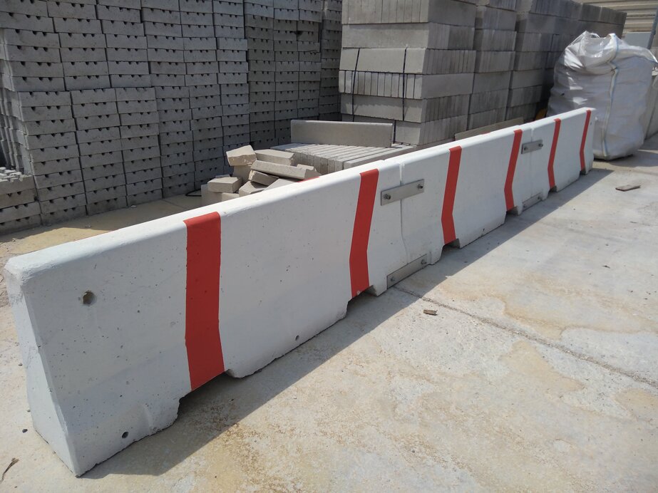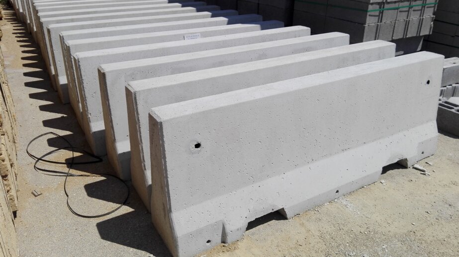 Elementi prefabbricati in calcestruzzo armato, profilo New Jersey, con fori superiori e bocche di lupo posizionate nella parte inferiore per il deflusso delle acque meteoriche.