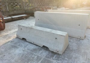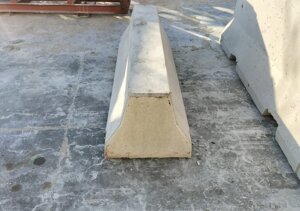 Elementi prefabbricati in calcestruzzo armato, profilo Mini New Jersey, con fori superiori e bocche di lupo posizionate nella parte inferiore per il deflusso delle acque meteoriche.