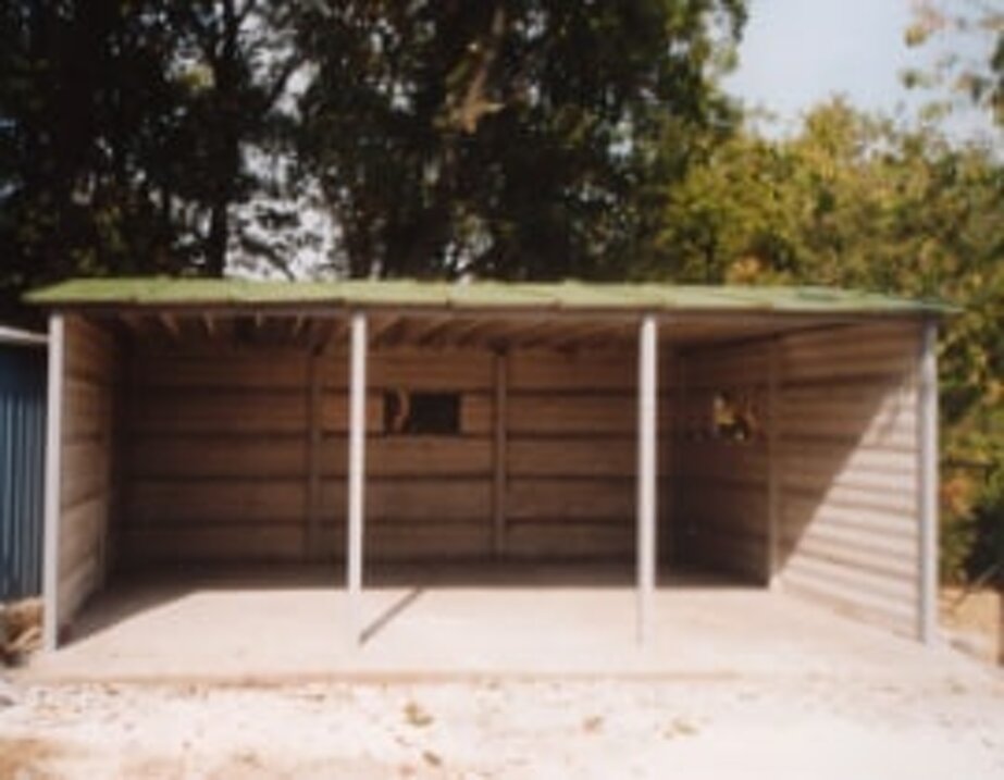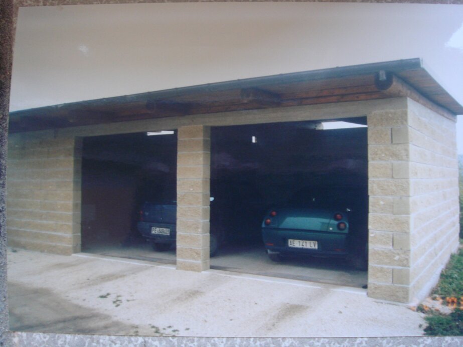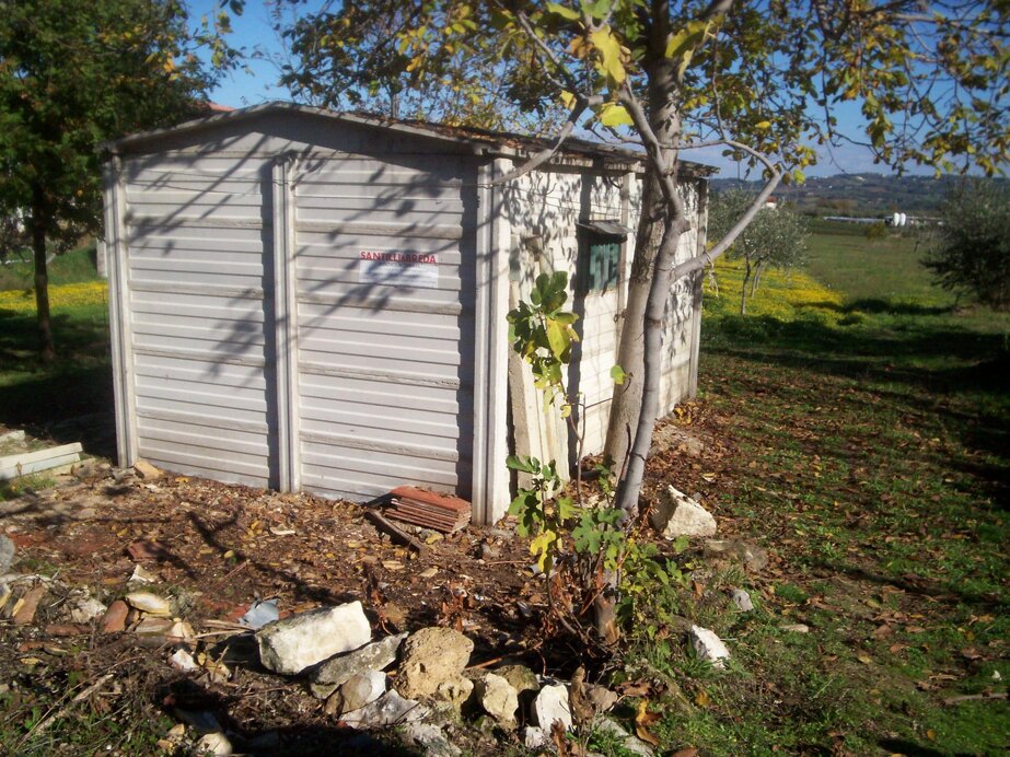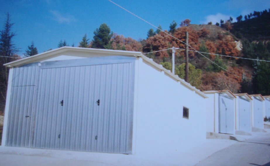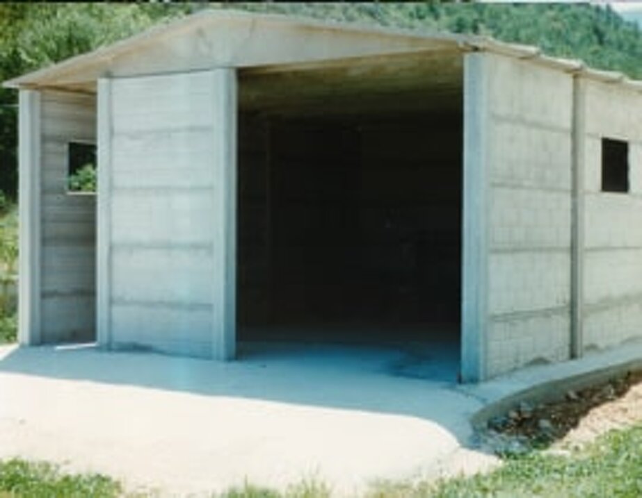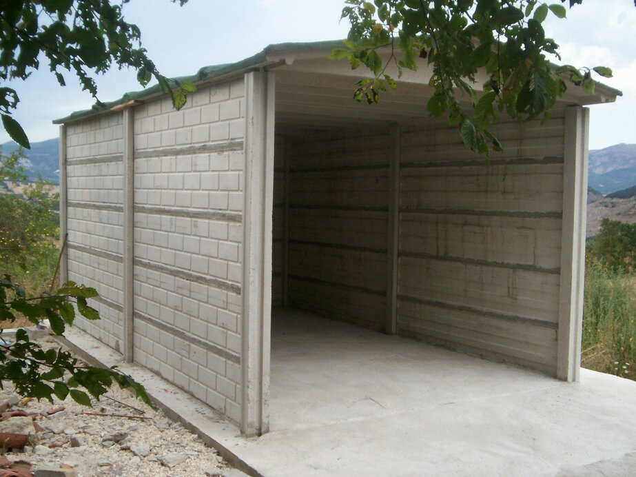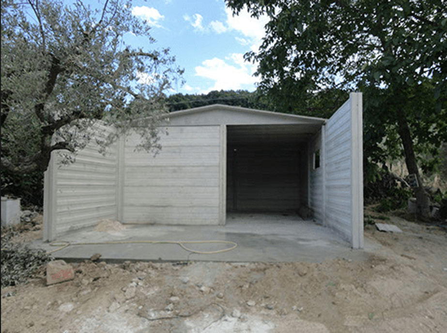 Box prefabbricato con basamento in cemento armato, pannelli in lastre a faccia vista, pilastri e capriate a doppia falda con destinazione a rimessa attrezzi agricoli o autovetture.